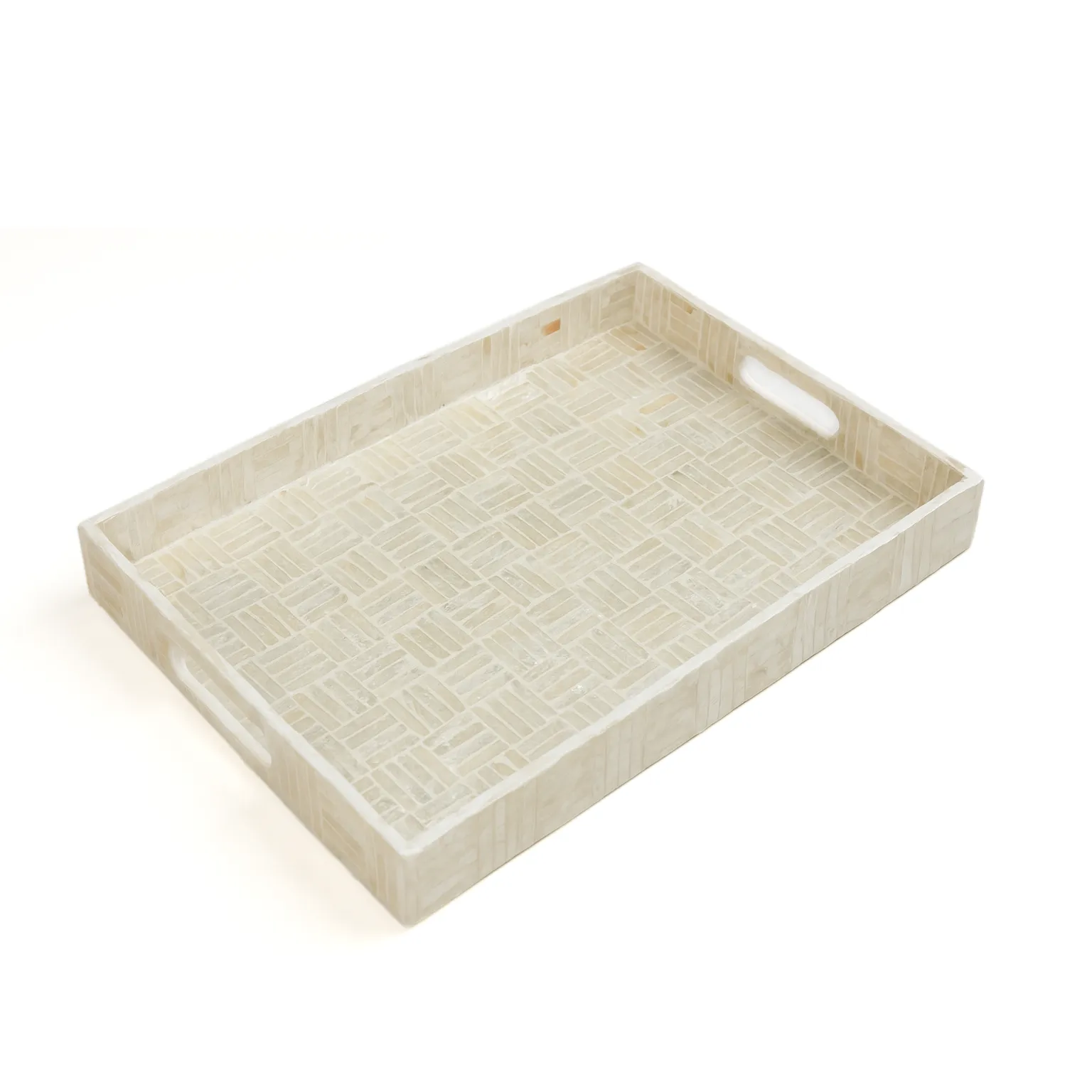 سینی اشلی با طراحی مستطیلی و سطحی پوشیده از قطعات صدف طبیعی، حس ظرافت و درخشش ملایمی را به فضا اضافه میکند. بافت هندسی و منظم صدفها، این سینی را به یک اکسسوری چشمنواز برای میز پذیرایی، کنسول، میز کنار مبل یا حتی سرو صبحانه تبدیل میکند.