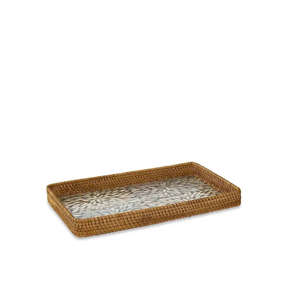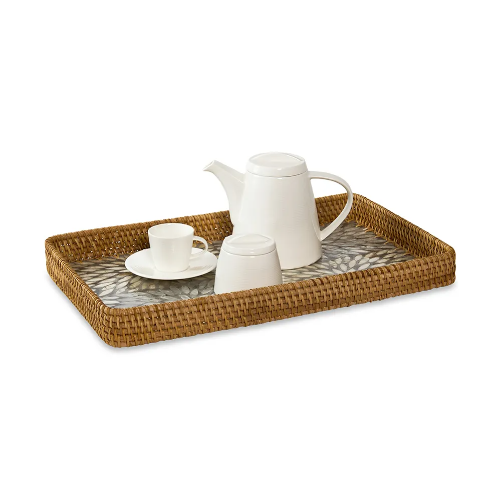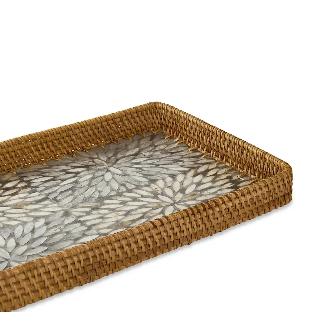 این سینی زیبا با ترکیب راتان دستبافت و کف ساختهشده از قطعات صدف طبیعی، جلوهای گرم، هنری و چشمگیر به فضا میدهد. طراحی مستطیلی آن برای استفاده روی میز ناهارخوری، کنسول، میز پذیرایی ایدهآل است. بافت راتان، حس طبیعی و ارگانیک ایجاد کرده و کف صدفی با انعکاس ملایم نور، ظاهری لوکس و متفاوت میسازد. این محصول یک انتخاب جذاب برای سرو و دکور مدرن، ساحلی، مینیمال یا وینتیج است.
