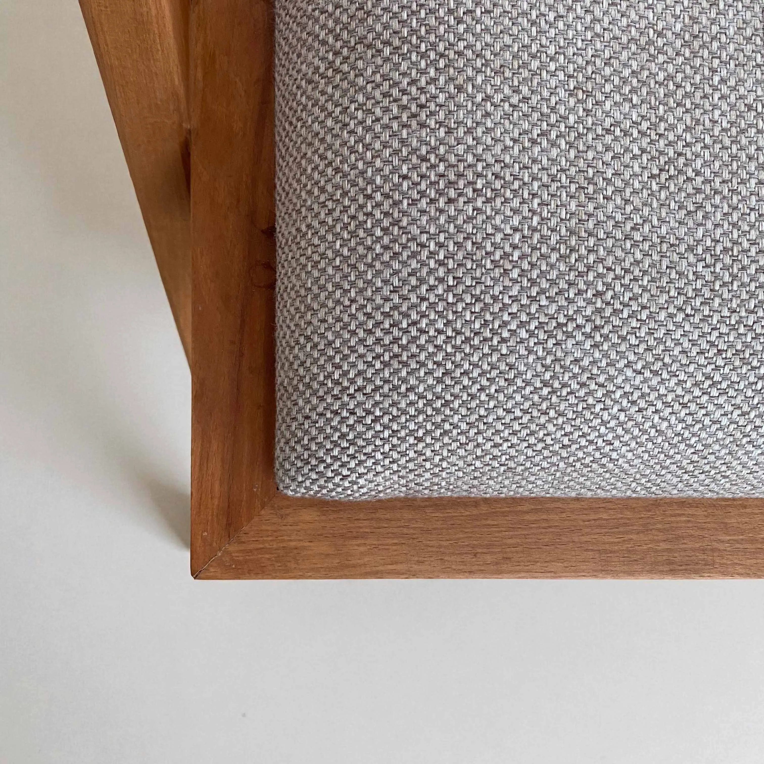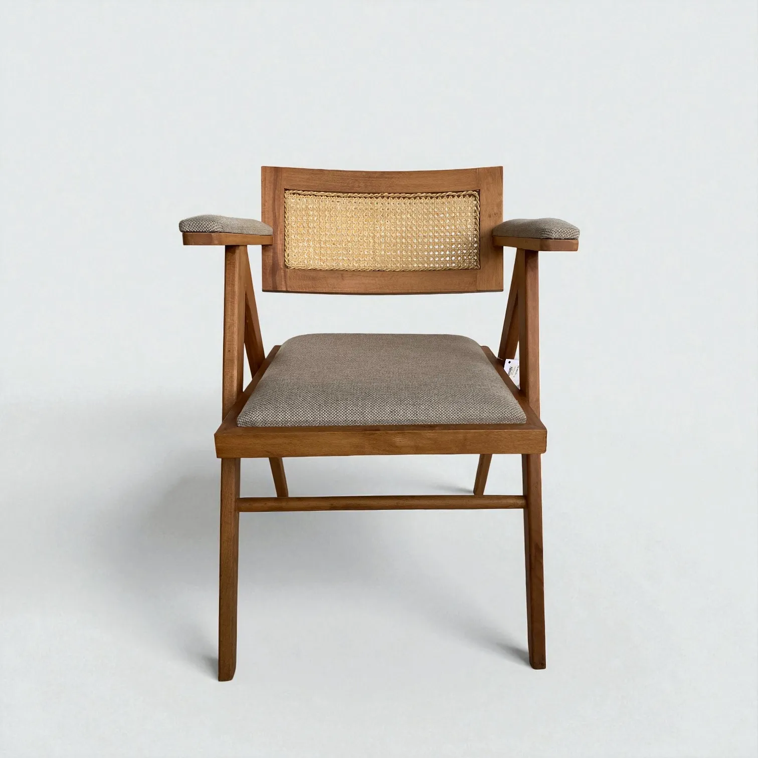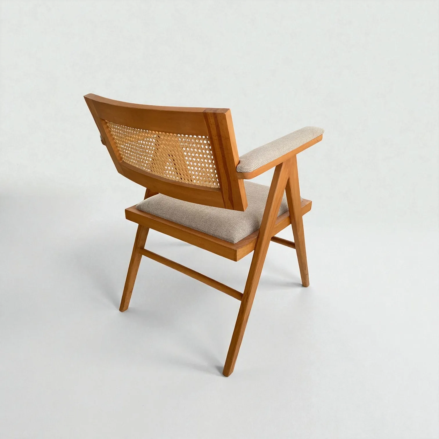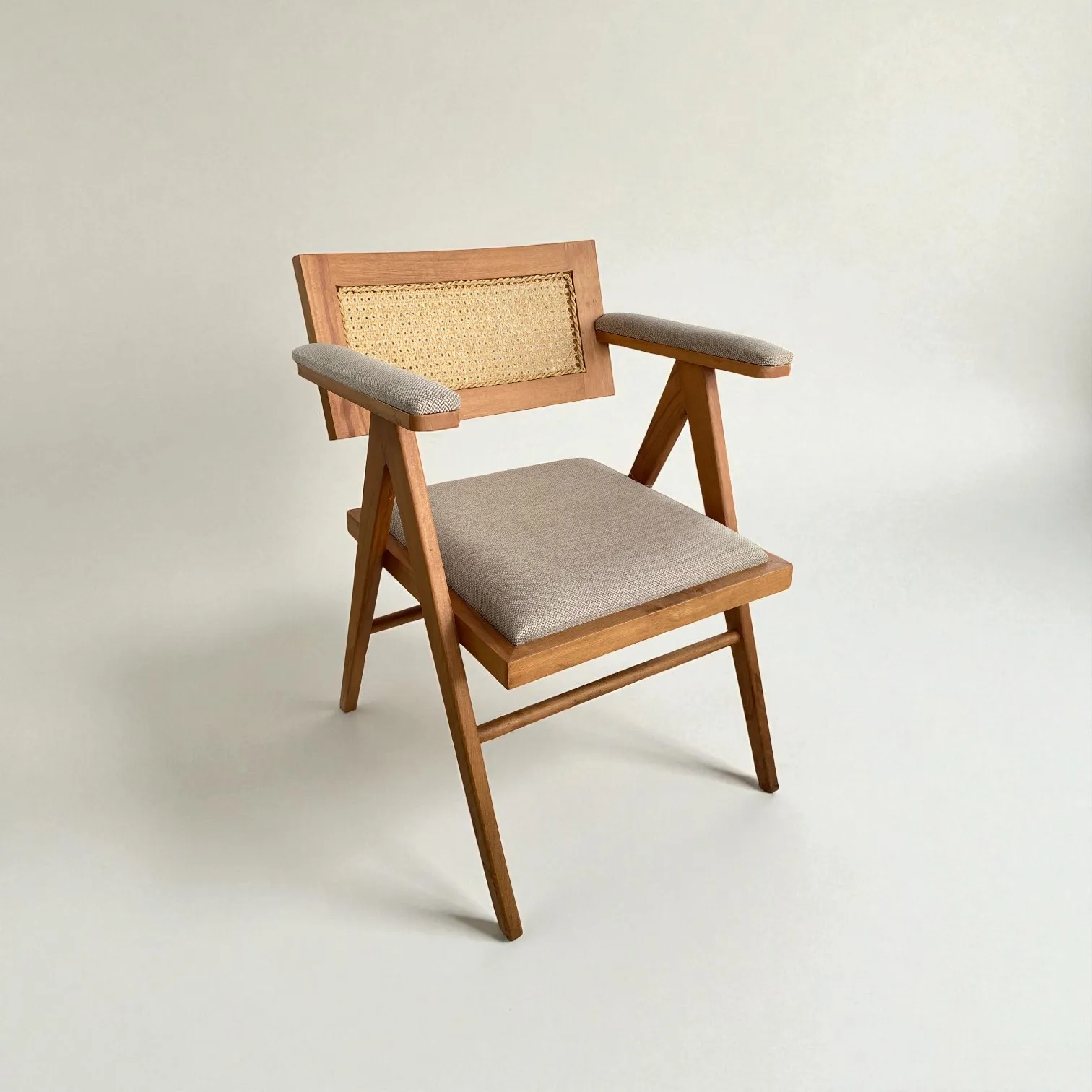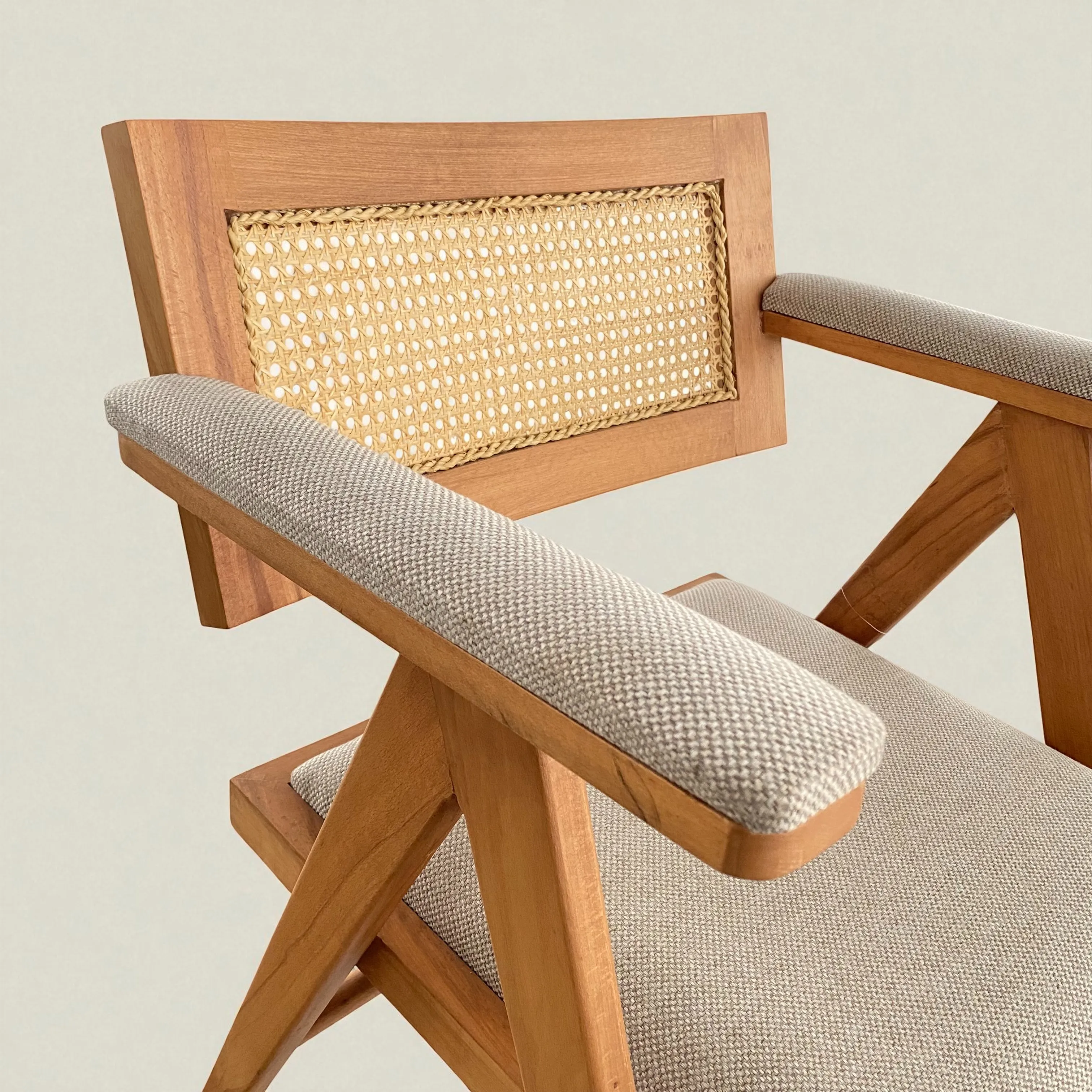 صندلی Liora از چوب طبیعی با رنگ گرم و بافت حصیری، با نشیمن پارچه ای لطیف ساخته شده است. این طراحی تلفیقی از سادگی اسکاندیناویایی و اصالت کلاسیک است.